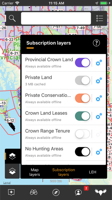 The BC Public Lands subscription includes 8 different map layers: General Use Crown Land, Private Land, Conservation Lands, No Hunting Zones, Crown Lease Land, Municipalities, Parks and Protected areas, and Recreation Sites and Trails.